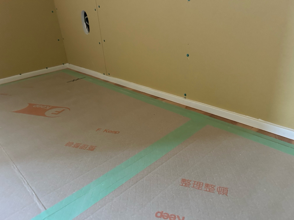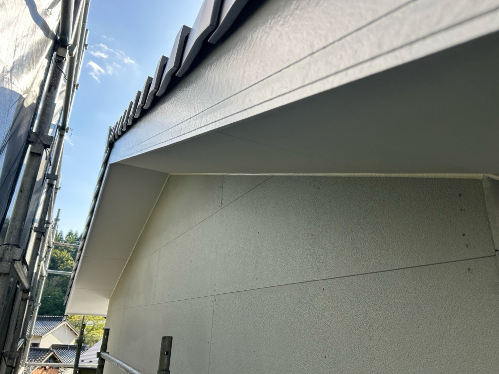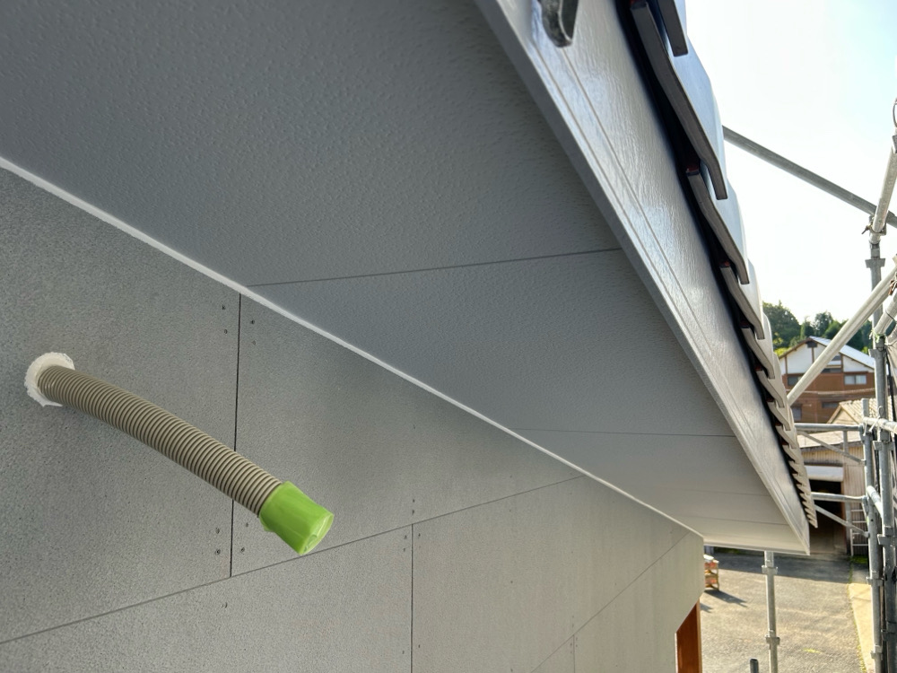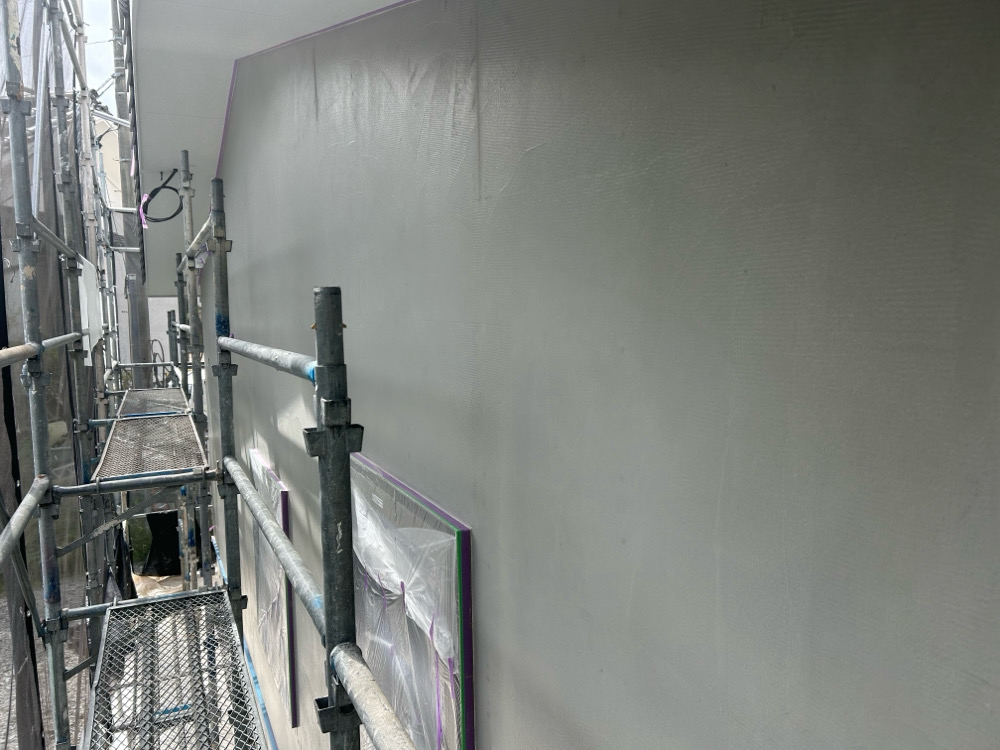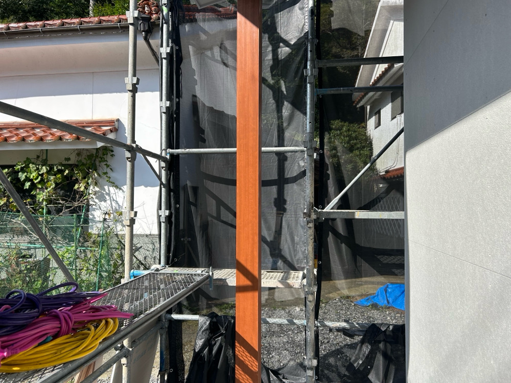 外部では、塗装工事が完了し、現在は塗り壁の下地を施工中です。