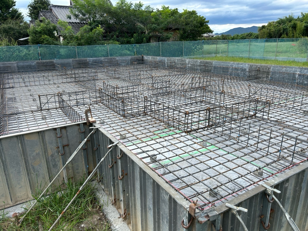 その後、基礎の骨組みとなる鉄筋を、基礎屋さんが図面をもとに組み上げます。