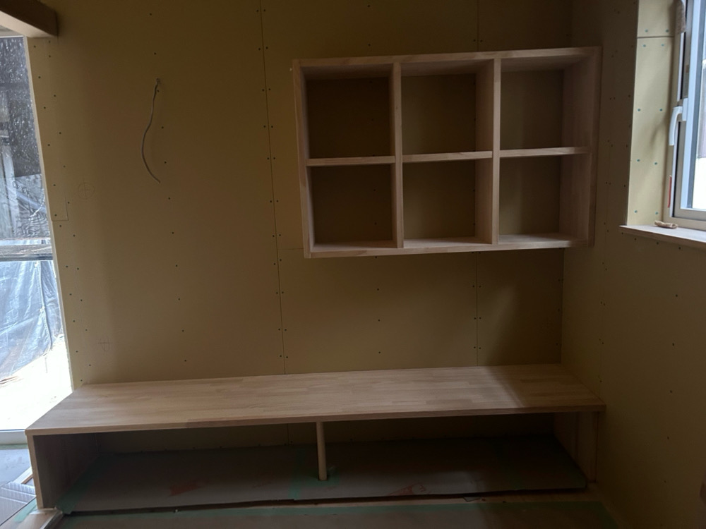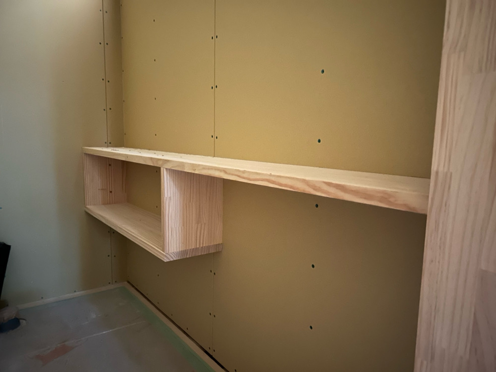 以前ブログでご紹介した細長い木材の上から、下の写真に写っている下地板を施工しています。